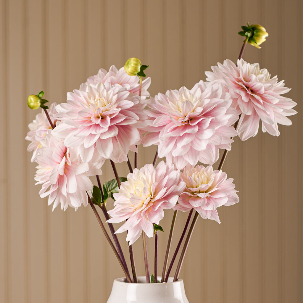 Silver Years est l'un des dahlias préférés des fleuristes et designers. Fleur de 4-4.5'' (10-11.5cm) qui fleurit dans un blush/champagne très doux. Des lignes violettes peuvent apparaître sur les pétales par temps plus frais. Excellente fleur coupée.