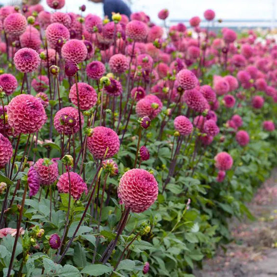 Une véritable vedette pour la fleur coupée ! Caitlin's Joy produit des balles rose framboise d'une intensité incroyable, portées par des tiges sombres et très fermes. C'est l'un des dahlias les plus productifs de la ferme.