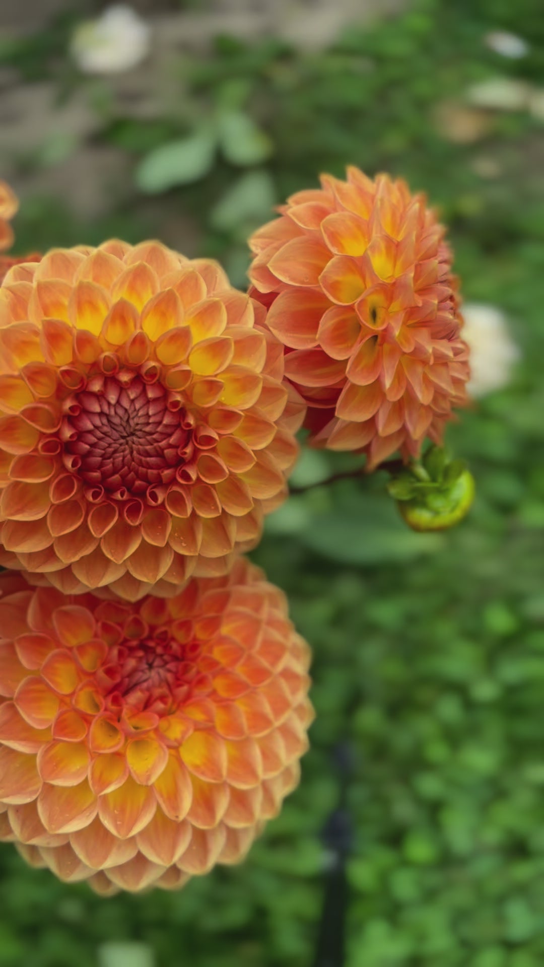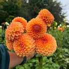 Assurément l'un des dahlias que nous cueillons le plus pour nos fleuristes ! Balle de 3.5-4.5''(9-11 cm) de forme remarquable. Beau mixte du couleur passant du gold au pêche au orange. Tiges longues et solides parfaites pour la fleur coupée. Cette variété a une longue tenue en vase.