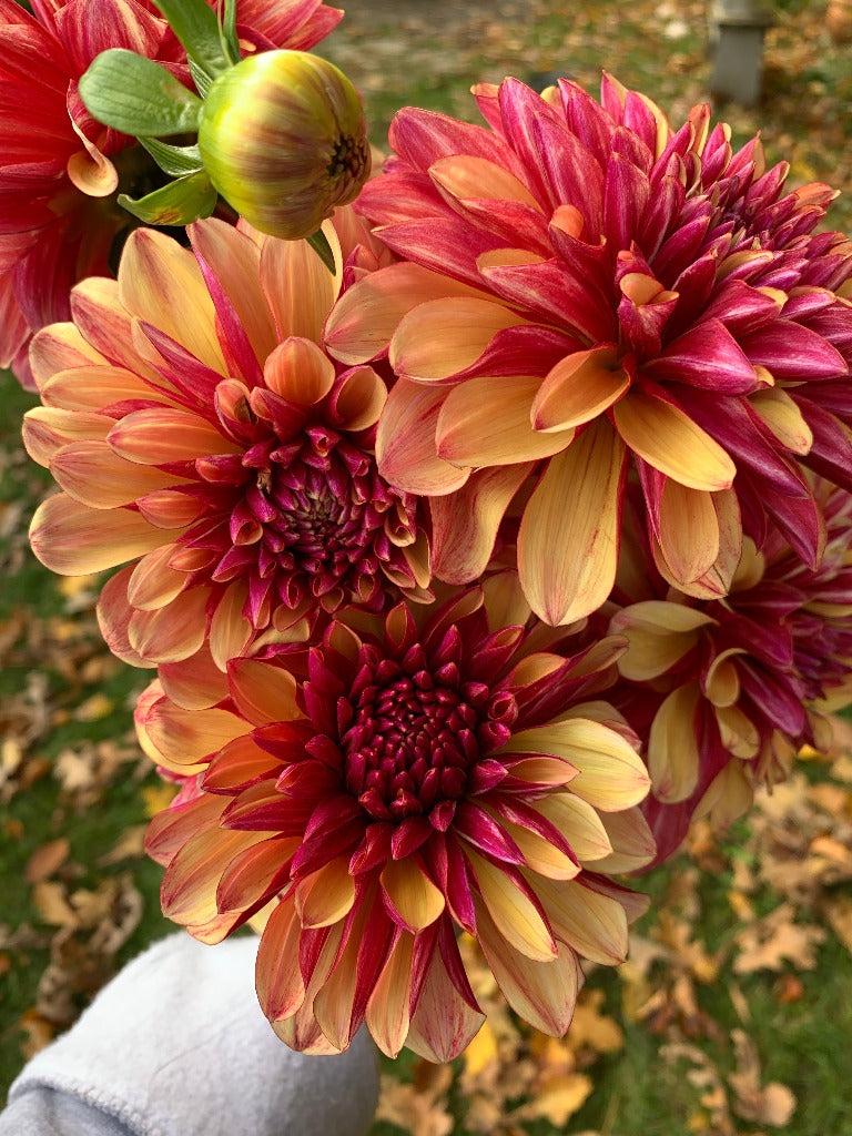 On voit très peu souvent de fleurs sur ce plant parce qu'on coupe les fleurs au fur et à mesure qu'elle pousse ! Gitt's Crazy est le plus gros dahlia dans la forme étoilée 6-7"(15-18 cm). Elle est un mélange des plus belles couleurs d'automne : jaune, orangé sur le dessus des pétales et rose foncé en-dessous. Plant très haut, excellent pour la fleur coupée. Gagnante de la médaille Derrill Hart division Étoilée, en 2012.