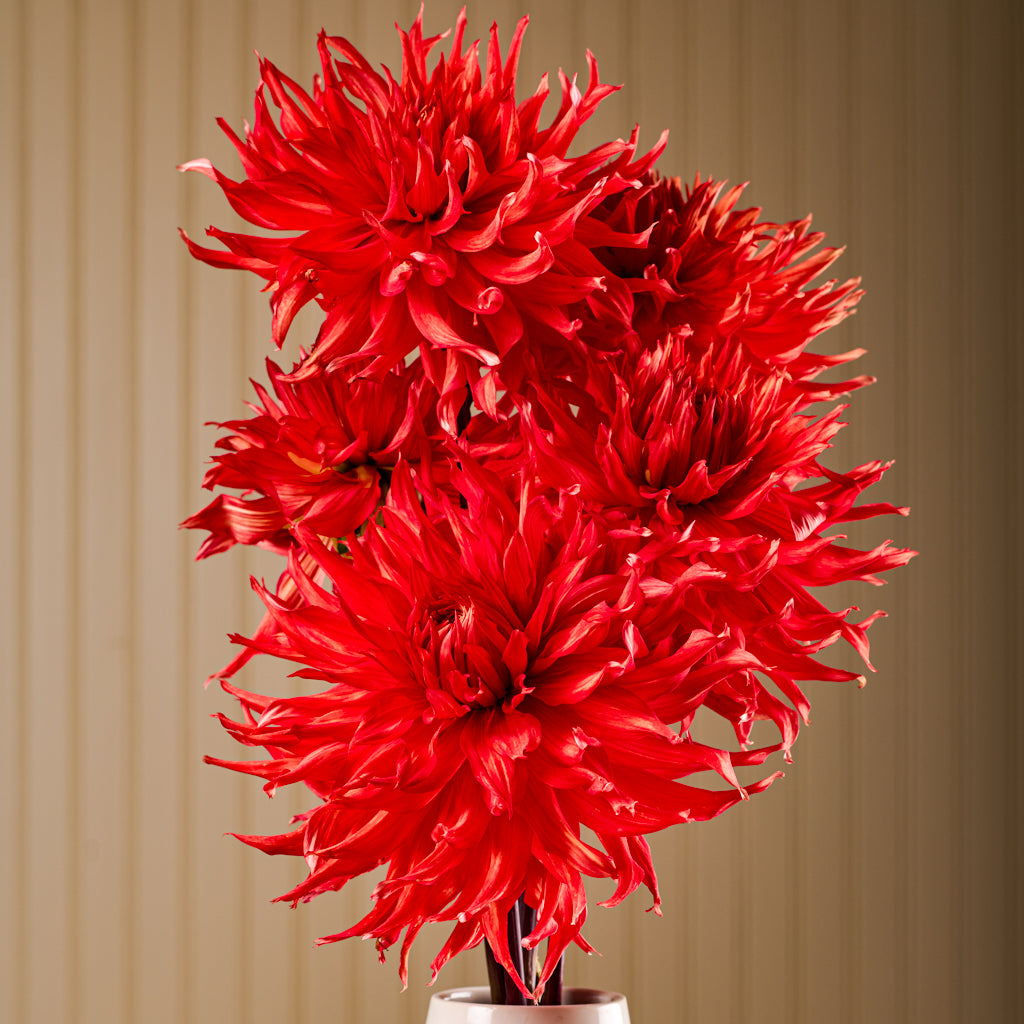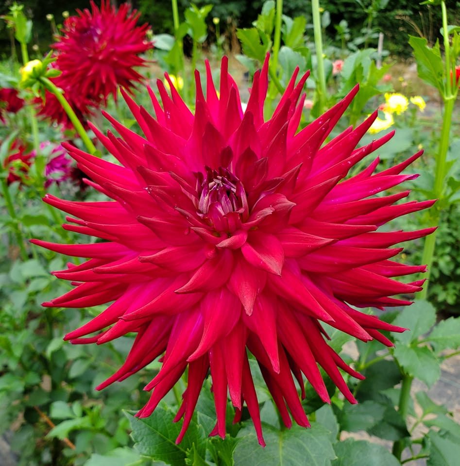 Cet énorme dahlia orangé-rouge porte ses fleurs bien plus haut que son feuillage luxuriant. Assurément une fleur vedette dans votre jardin.