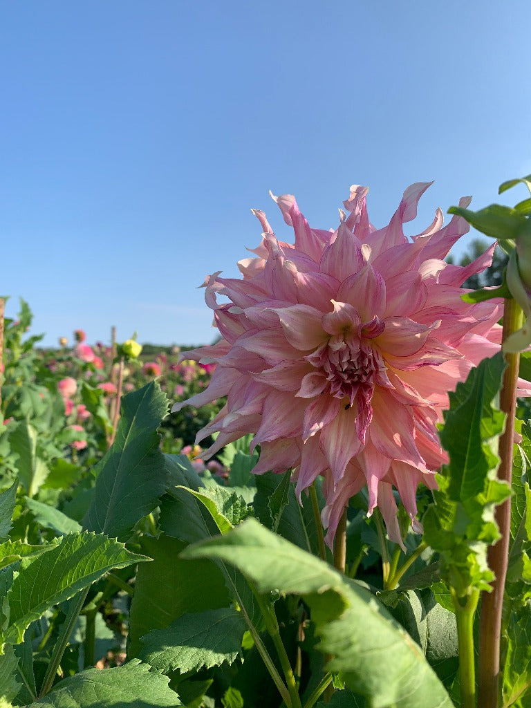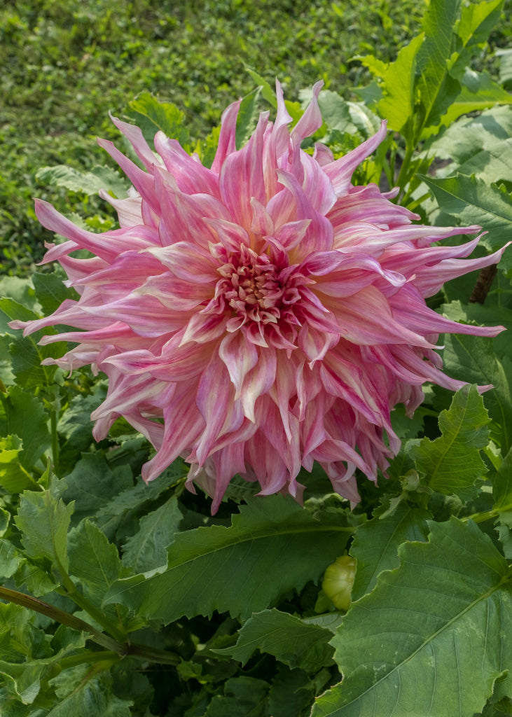 Huge ruffled flower over 10" in a mix of pink, beige, yellow and dark pink. The plant grows very tall with good stems to support these large flowers. I love incorporating these flowers into floral arrangements since its petals give a beautiful movement.