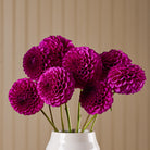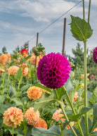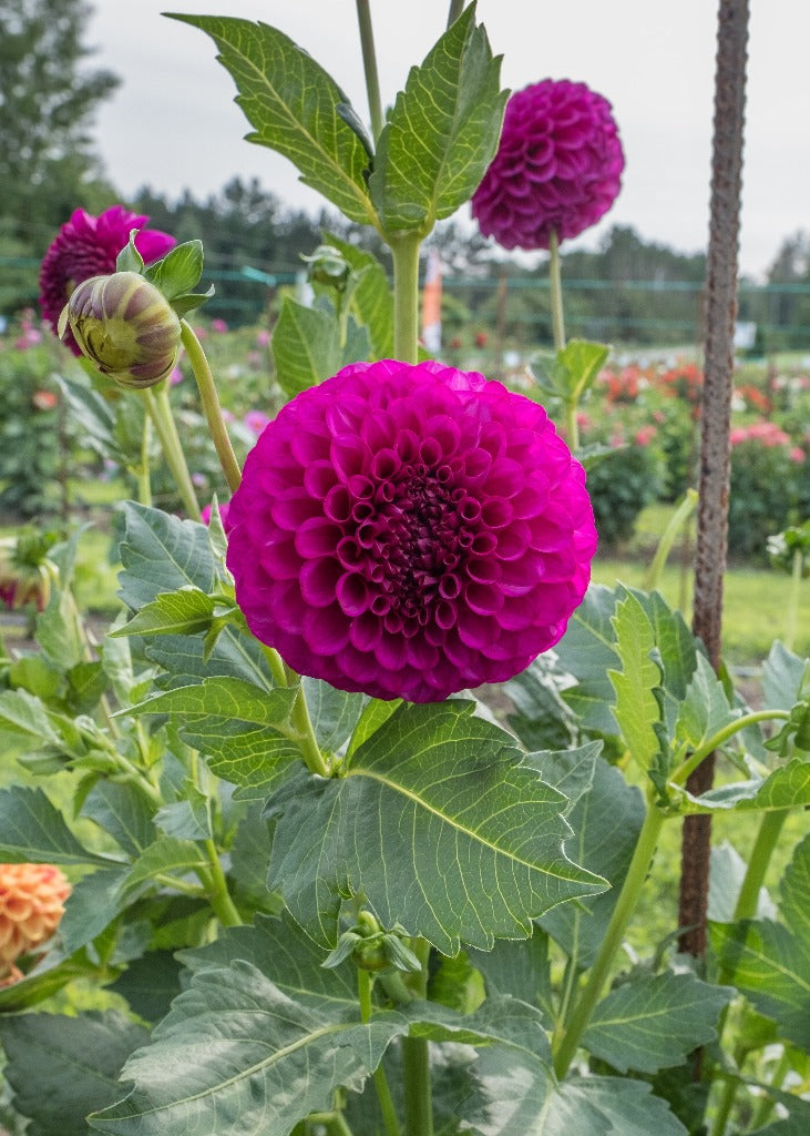 3-3.5" flower in a beautiful dark purple that looks a lot like a mini ball. It is a strong, flowering plant. Long life on the plant and in the vase, excellent cut flower.