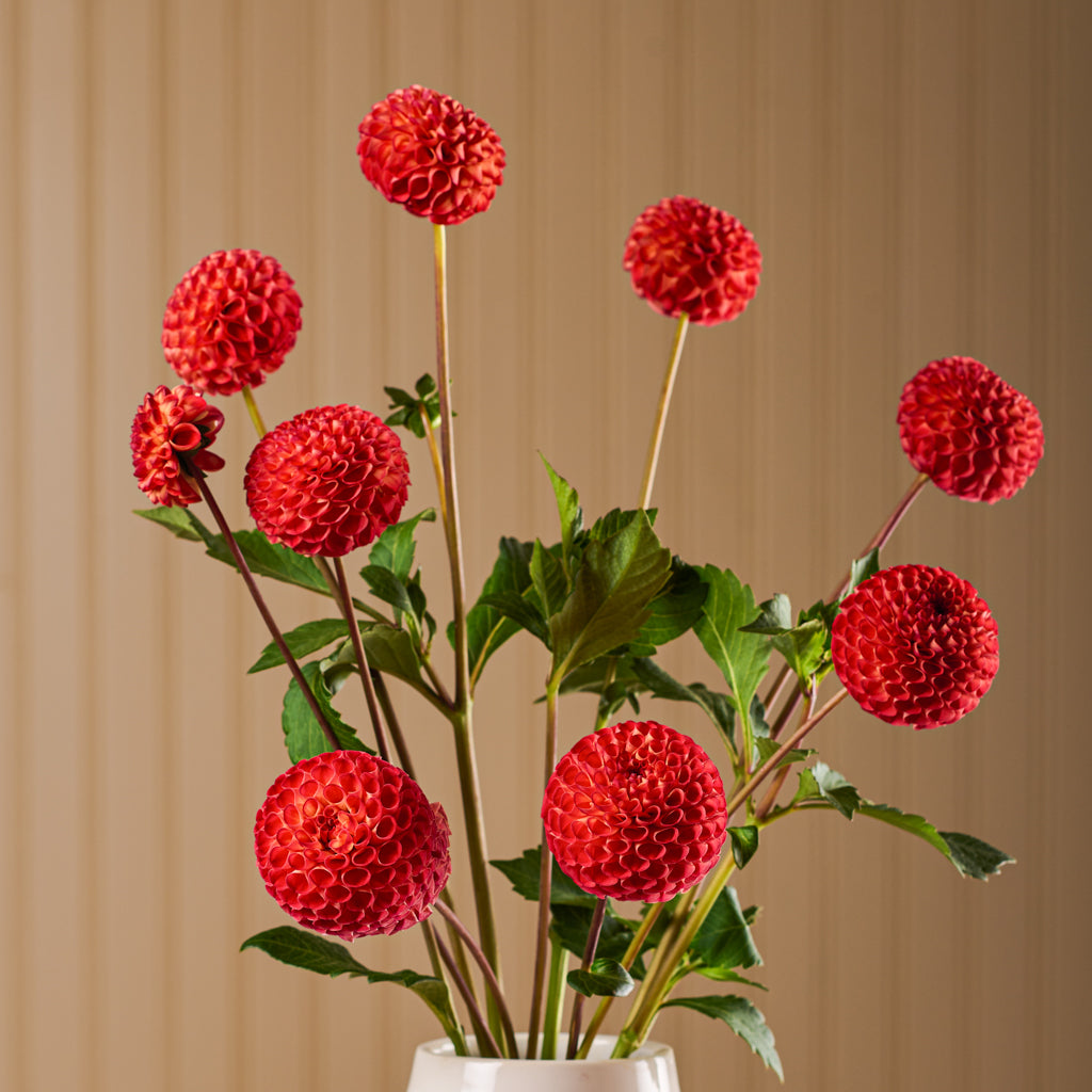 We love pompoms! This type of dahlia always offers very flowering plants and the flowers last very long in a vase. 1.5-2'' flower, Irish Glow is one of the best pompoms and is part of the Fabulous 50. It is red with a subtle touch of orange in the center.