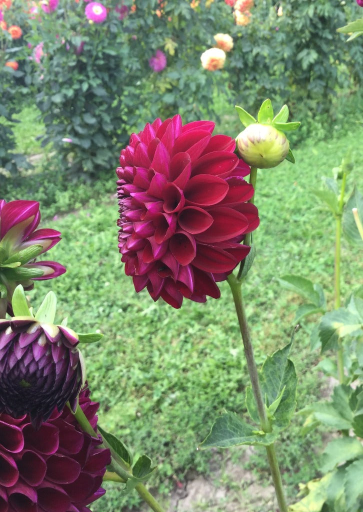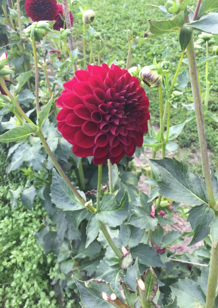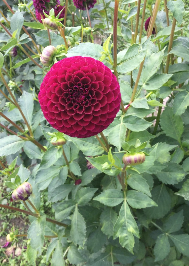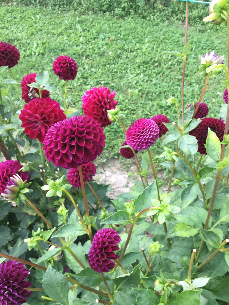 Fleurs bourgognes de 4-4.5"(10-12 cm) ressemblant à une balle. Variété excellente pour la fleurs coupée. Le plant produit beaucoup de fleurs sur de longues tiges.