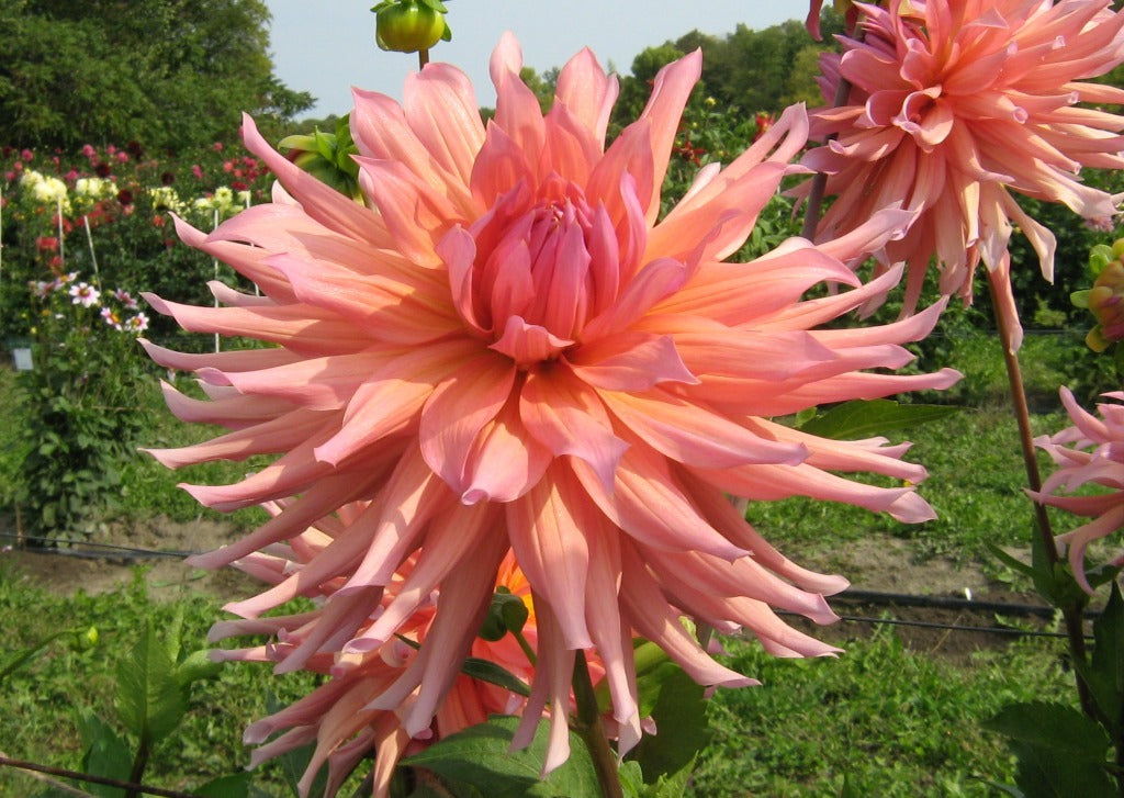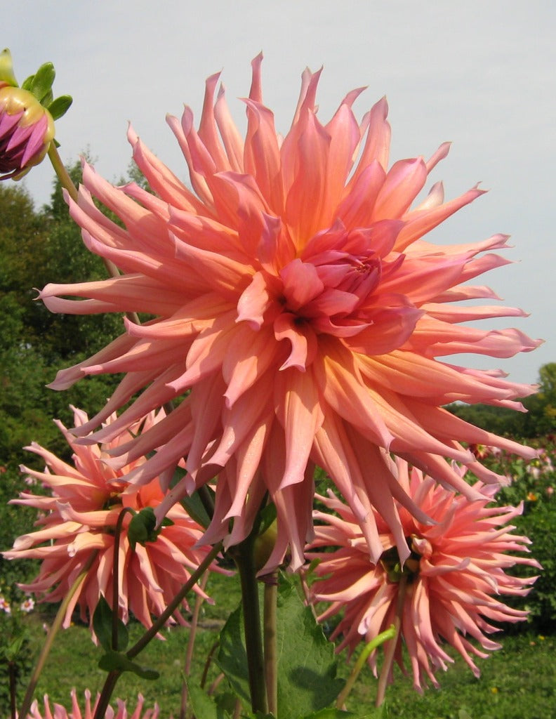 Beau semi-cactus dans un mélange de rose tendre et pêche avec un dégradé de jaune au centre. Fleur de 8''-9'' sur un plant solide.
